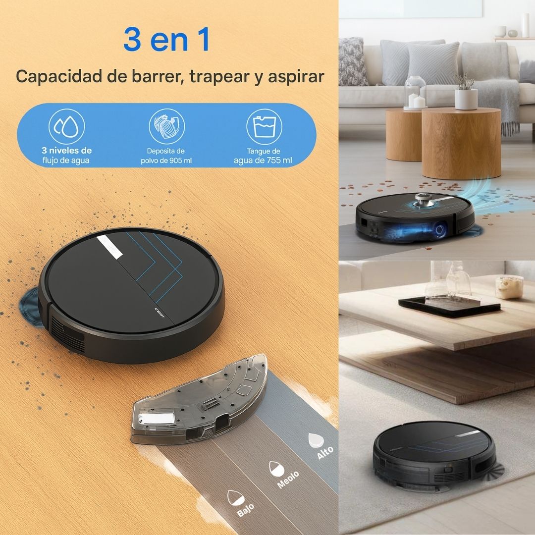 Tiene un depósito de polvo de 305 ml y un tanque de agua de 255 ml, suficiente para limpiar áreas amplias sin necesidad de recargas constantes.
