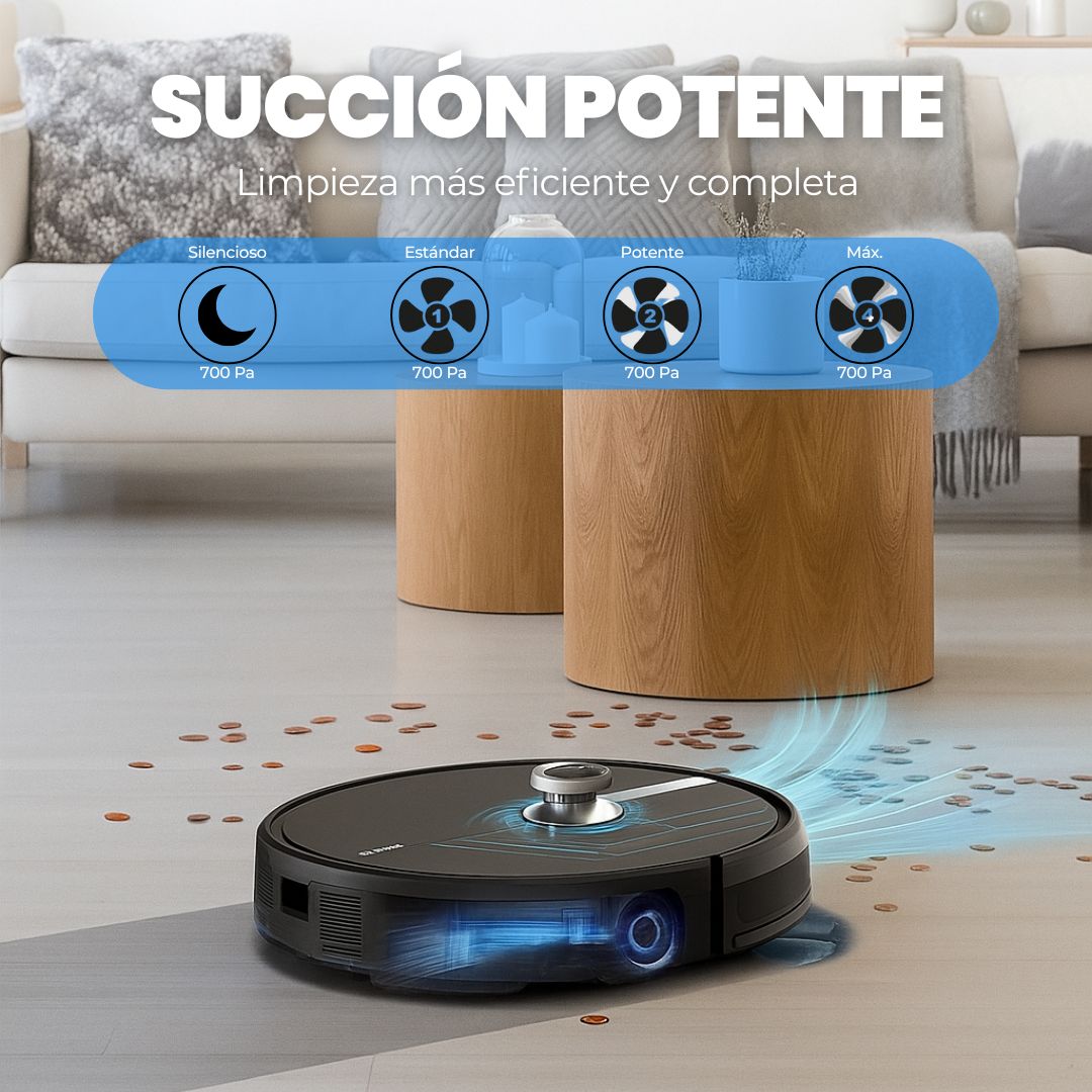 Ofrece una autonomía de hasta 120 minutos de limpieza continua. Al agotarse, vuelve solo a la base para recargarse automáticamente.