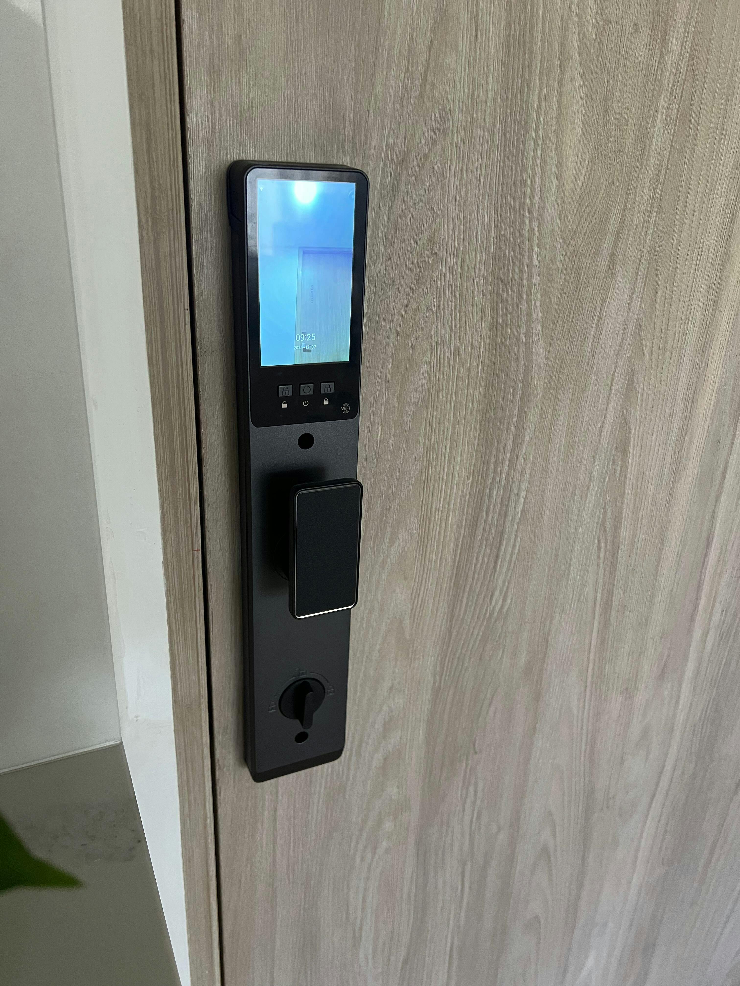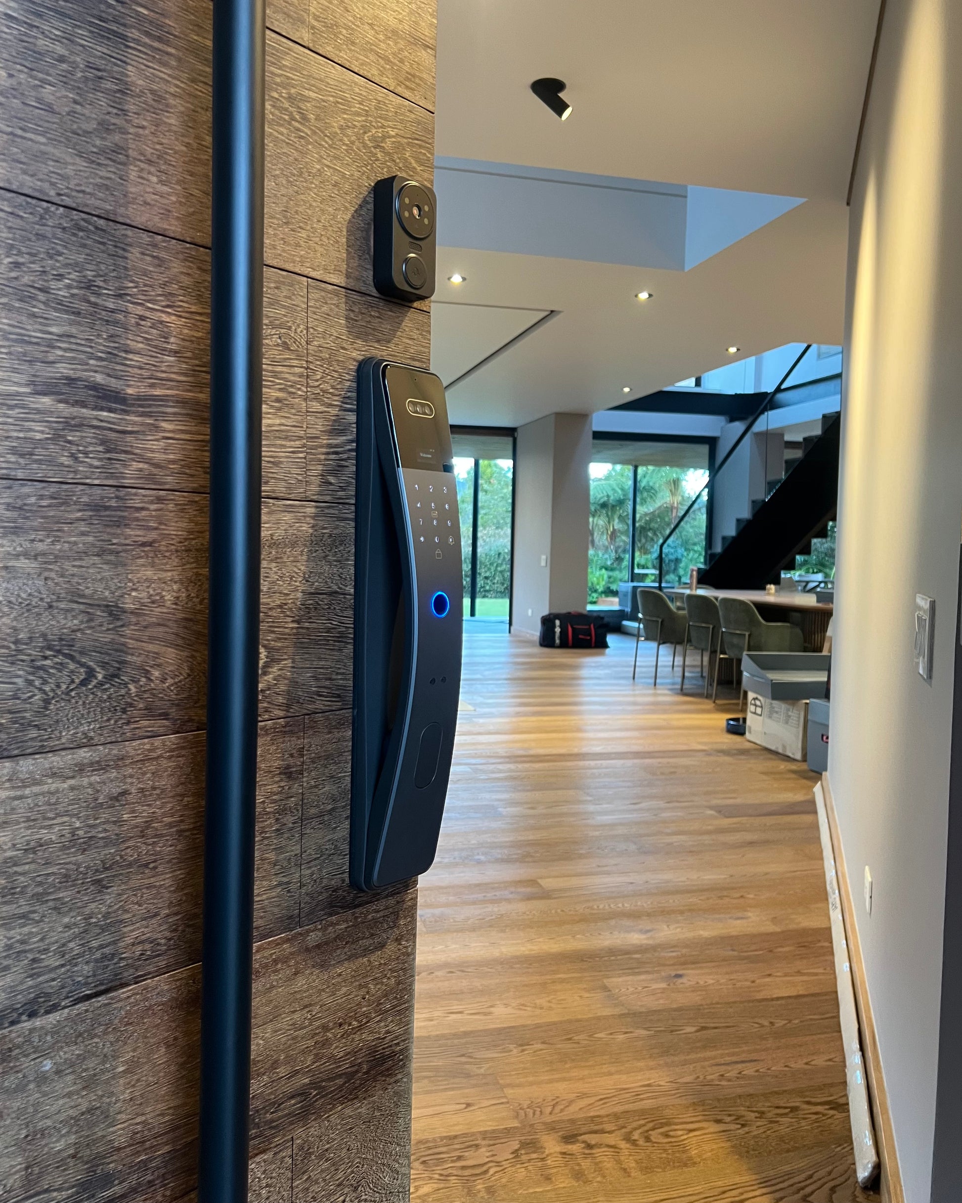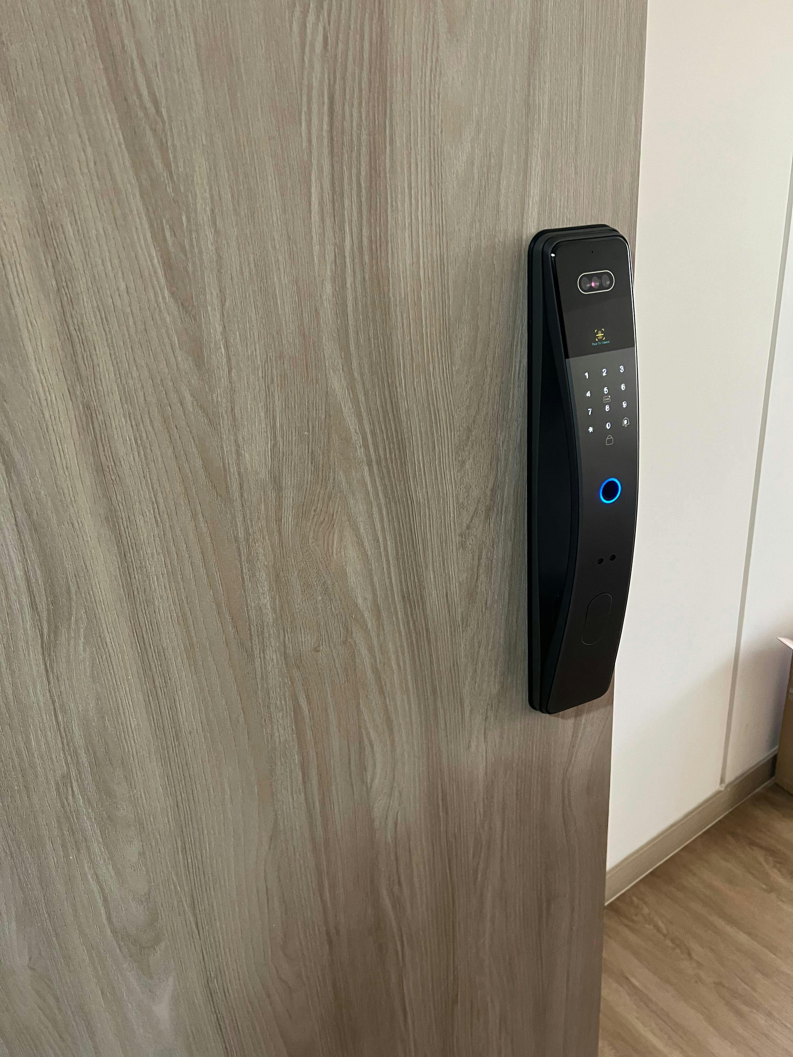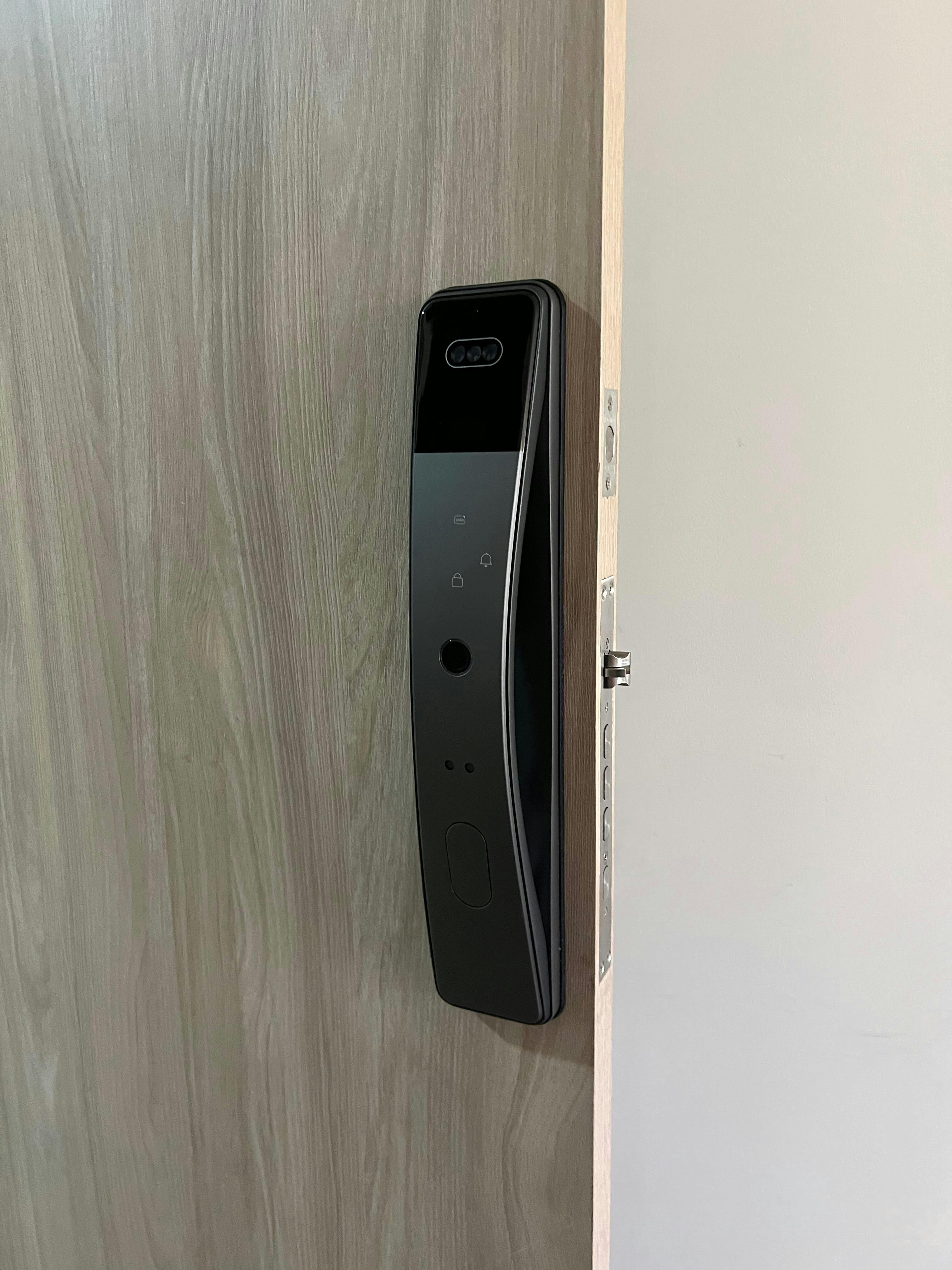 “Instalación en puerta de madera ubicada en Cali, Valle del Cauca.”